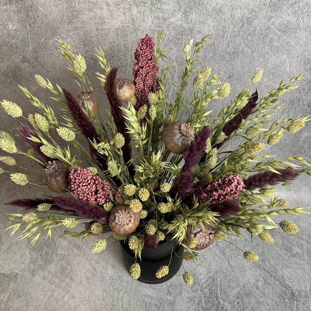 Een warme combinatie van lila en naturel tinten. Het bevat oa papavers, grassen, haver, sierpluimen, en Indian corn.