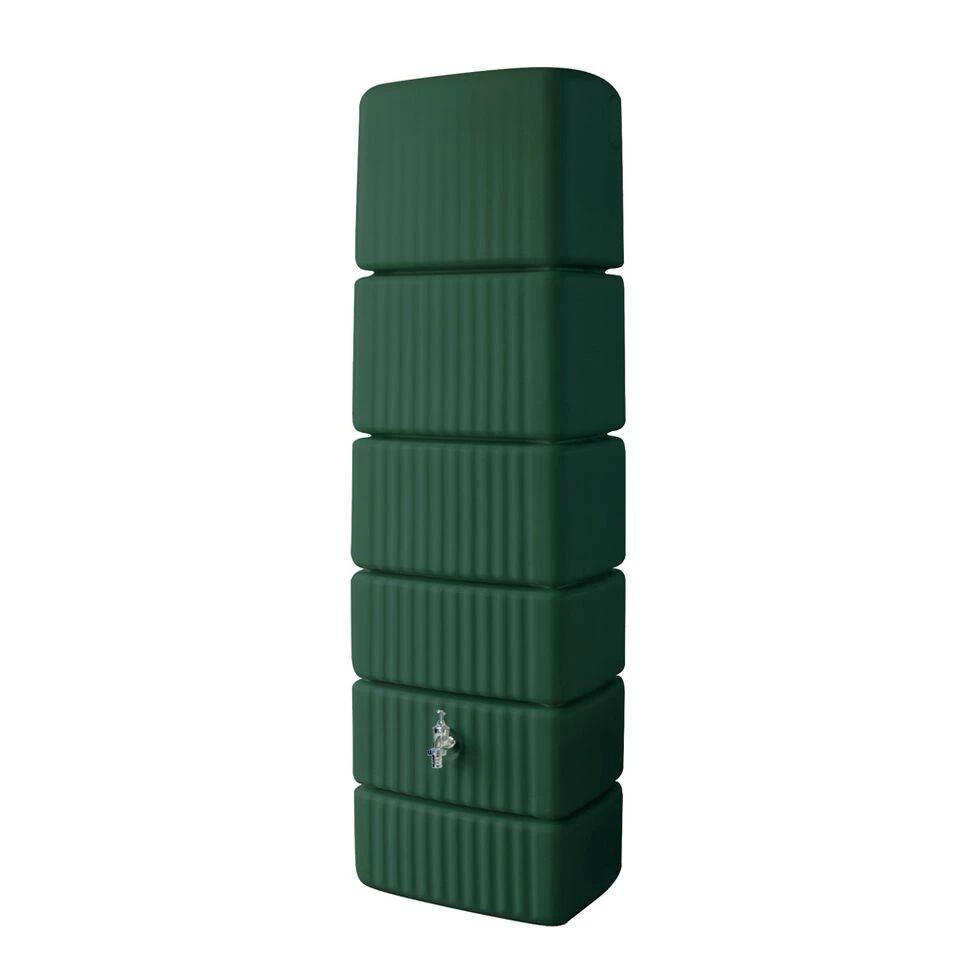 Prachtige modern vormgegeven Garantia SLIM wandtank van 300 liter. Deze degelijke groene kunststof regenton neemt weinig ruimte in beslag door de smalle, hoge vorm en staat desondanks zeer stevig op de grond. De 300 liter is gemeten vanaf de kraan, dus dit zijn bruikbare liters. Doordat de kraan op 39,5 cm is geplaatst heb je geen voet nodig om er een emmer of gieter onder te plaatsen. De Garantia Slim wandtank wordt geleverd met een windverzekeringsset. Je kunt de regenton gemakkelijk op de regenpijp aansluiten met een regenton vulautomaat (apart verkrijgbaar).