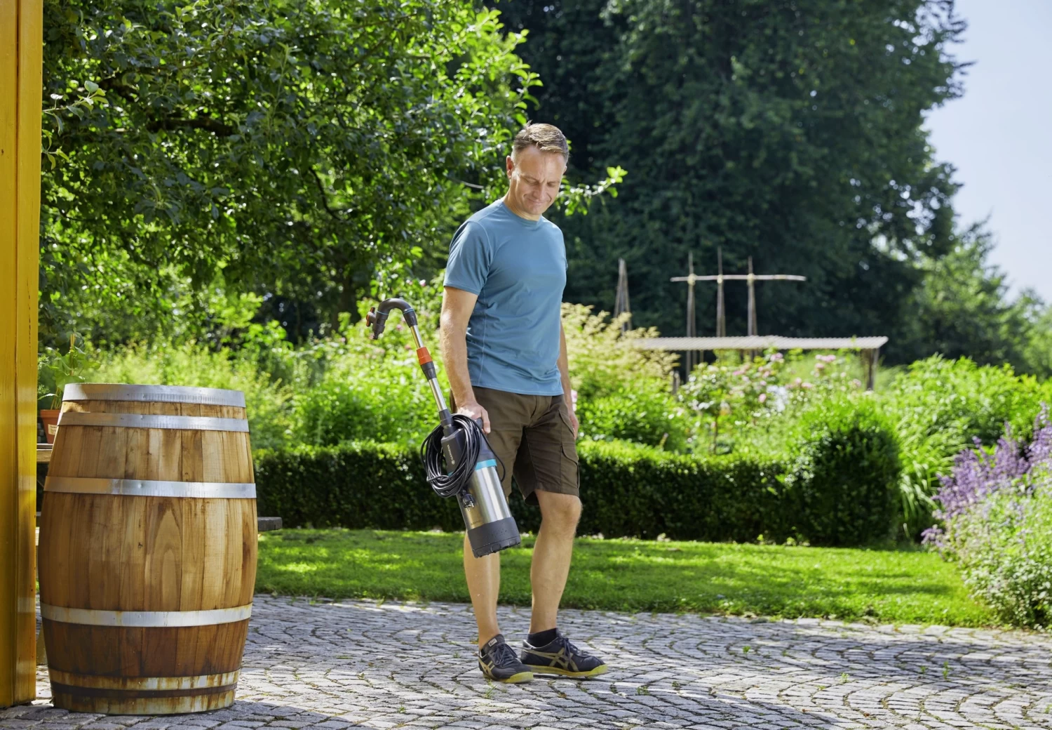 De automatische omschakelfunctie schakelt de pomp automatisch in en uit als er water aan wordt gezogen. De pomp kan zelfs worden gebruikt met een besproeiingscomputer. Het geïntegreerde filter is eenvoudig te reinigen en zorgt ervoor dat de pomp en aangesloten apparaten niet vervuild, verstopt of beschadigd raken. Met de gepatenteerde en voor doorstroming geoptimaliseerde telescopische buis van licht en duurzaam aluminium kun je het water zonder verlies of knikken over de rand van het vat sturen: stel de buis eenvoudig in op de juiste lengte (760-960 mm) voor de regenton.