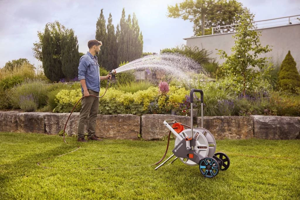 Natuurlijk wil je je tuin op de beste manier verzorgen. Maar verzorg je je tuinslang ook op de beste manier? Op de Gardena Slangenwagen AquaRoll L Easy Metal Set berg jij jouw tuinslag zorgvuldig en ruimtebesparend op. Hiermee voorkom je dus niet alleen dat je tuinslang rond blijft slingeren, je houdt ook meer ruimte over in je schuur! De aquaroll beschikt over een ergonomische metalen zwengel met zachte kunststof onderdelen en een stevige slanggeleider. Hierdoor rol jij de tuinslang erg gemakkelijk op.