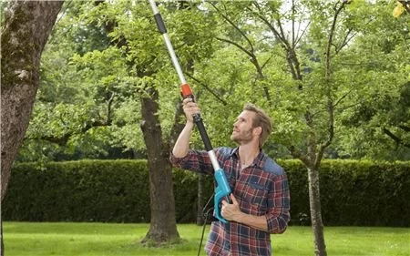 Met de Gardena Telescopische kettingzaag TCS 720/20 snoei je heel eenvoudig hoger gelegen takken in de boom. De telescopische steel is namelijk uitschuifbaar waardoor takken tot wel 4.40 m veilig gesnoeid kunnen worden. Een trap is voor het snoeien overbodig. Doordat de kop van de snoeischaar kantelbaar is kun je een ideale zaaghoek creëren. Zo kun je naast hoger gelegen takken ook laag bij de grond of op moeilijk bereikbare plekken snoeien.