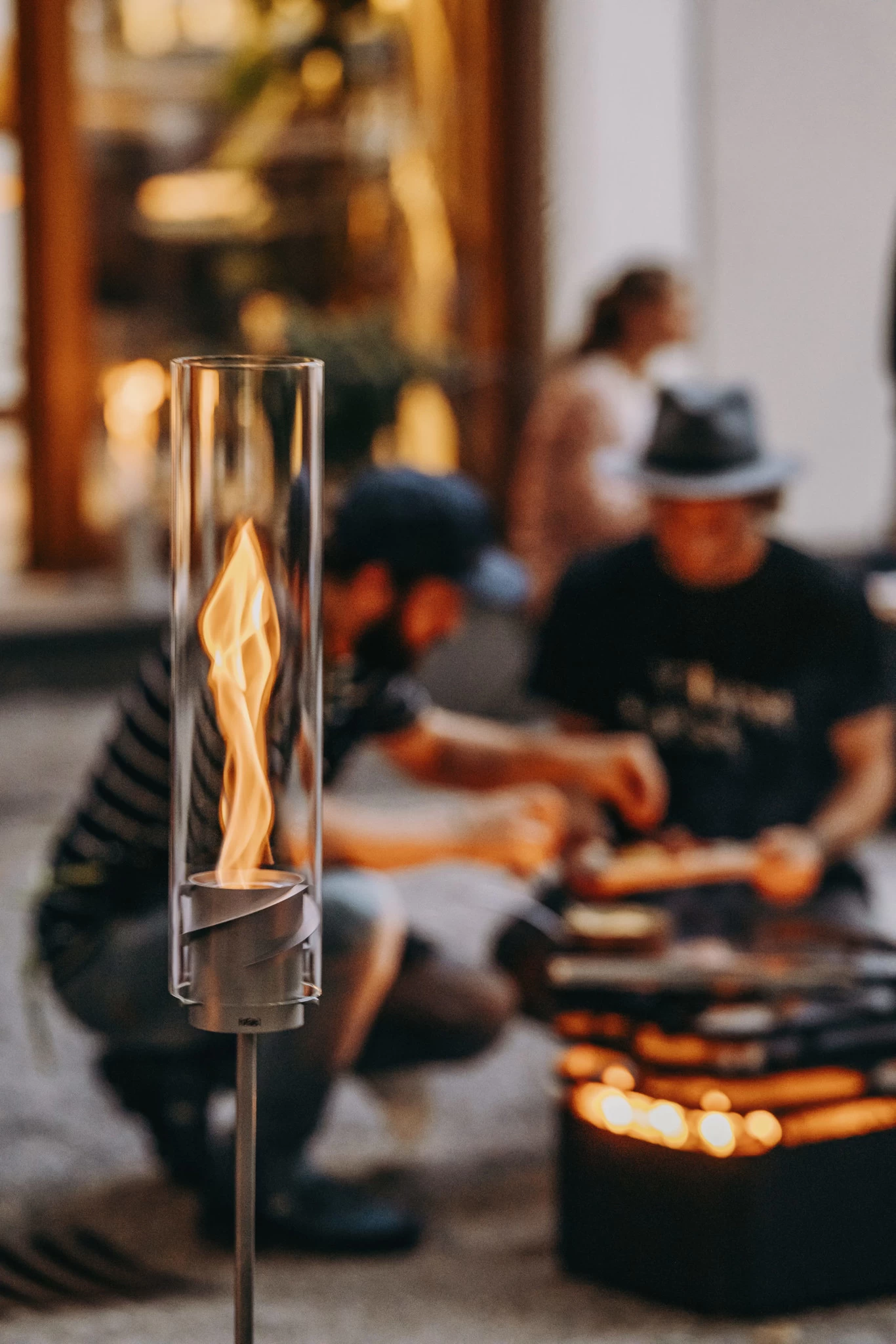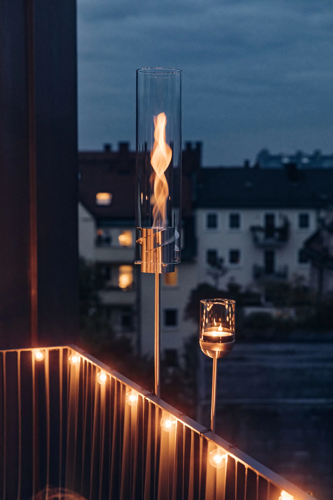 Met de fascinerende vlamwerveling creëert de Spin een kampvuur sfeer op balkon en terras en wordt zo de blikvanger van de avond. De fakkel bestaat uit een roestvrijstalen behuizing en grondpen en een cilinder van borosilicaatglas. De roterende vlammenspeling is gebaseerd op bio-ethanol, dat in een blikje wordt verbrand. Het los verkrijgbare blikje wordt eenvoudig in de antislip houder gestoken en verlicht. De cilinder wordt dan bovenop geplaatst en het vuur wervelt anderhalf uur lang. Als toortsvariant kan Spin eenvoudig in de grond worden bevestigd. Door de meegeleverde 4-delige grondpen kunnen verschillende hoogtes worden ingesteld en gerealiseerd. De afzonderlijke delen van de spike verschillen in lengte (7 cm + 34 cm + 48 cm) en hebben een extra aardingspijker, wat een stabiele ondersteuning garandeert. • Gebruik als tuinfakkel • Te bevestigen in de grond (met aardnagel) • Eenvoudige schroefmontage zonder gereedschap • Gemaakt van roestvrijstaal • Alleen voor gebruik buitenshuis Bij Höfats zijn ze dol op design. Dit jonge bedrijf zet alles op alles om functionele, mooie en unieke producten op de markt te brengen. Van barbecues tot tuinhaarden: Höfats maakt je tuin net even wat mooier. Ze streven ernaar de beste in hun productcategorie te zijn. Het merk is altijd trouw gebleven aan dit streven bij het ontwikkelen van producten, of het nu een zeer functionele barbecue of een eenvoudig schort is. Alle producten worden volledig in Duitsland geproduceerd en overtuigen door hoogwaardige materialen en duurzame kwaliteit. Sinds de oprichting in 2015 zijn ze bekroond met – geloof het of niet – 40 prestigieuze designprijzen. Dit jaar is Höfats vooral trots op de Archiproducts Design Award en drie Iconic Awards: Innovative Interior (categorie outdoor), waaronder een “best of best” voor de vuurkorf CUBE.
