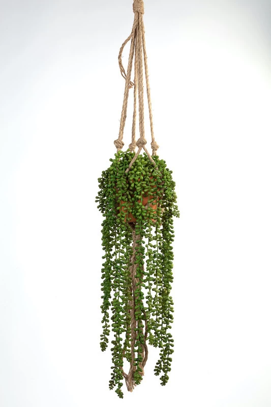 Senecio, geleverd in een roodstenen terra cotta pot van 13 cm doorsnede en een touw met een totale lengte 105cm. De talrijke groene erwten maken het een mooie volle hanger, compleet met touw.