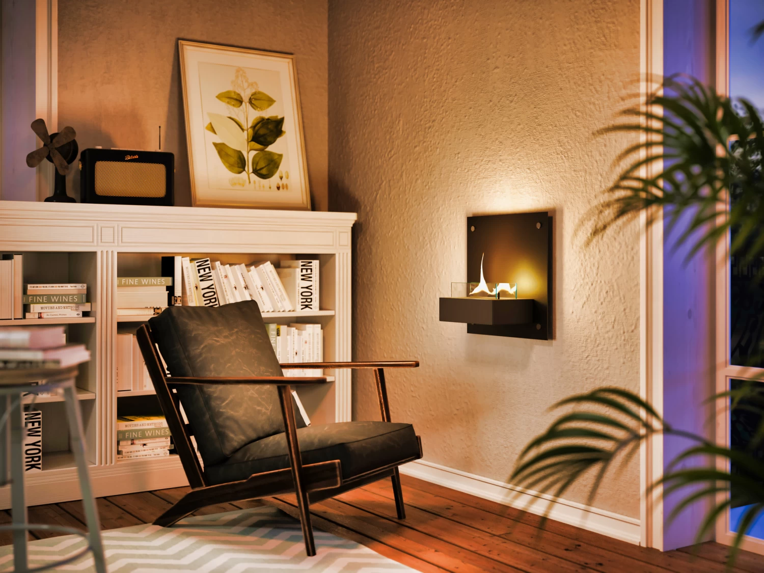 De Tenderflame Solo 90 is een stijlvolle wandhaard van bescheiden formaat. Het moderne design past in uiteenlopende interieurs en omdat hij dubbelwandig is met luchtspleet kan de haard veilig op alle oppervlakken opgehangen worden. De Solo biedt gezelligheid en warmte met zijn dansende vlam en dat zonder dat er een schoorsteen nodig is. Hij brandt op Tenderfuel en brandt, geheel gevuld, gedurende ca. 4,5 uur en dat met minimale roet, rook en geur. Het reservoir onder de speciaal ontwikkelde roestvrijstalen lonten heeft een inhoud van 500 ml. De Tenderfuel is naast schoon ook veilig daar het niet licht ontvlambaar is. De Tenderflame Solo 90 is zowel binnen als buiten te gebruiken en heeft een afmeting van ca. 45 x 23 x 45 cm.