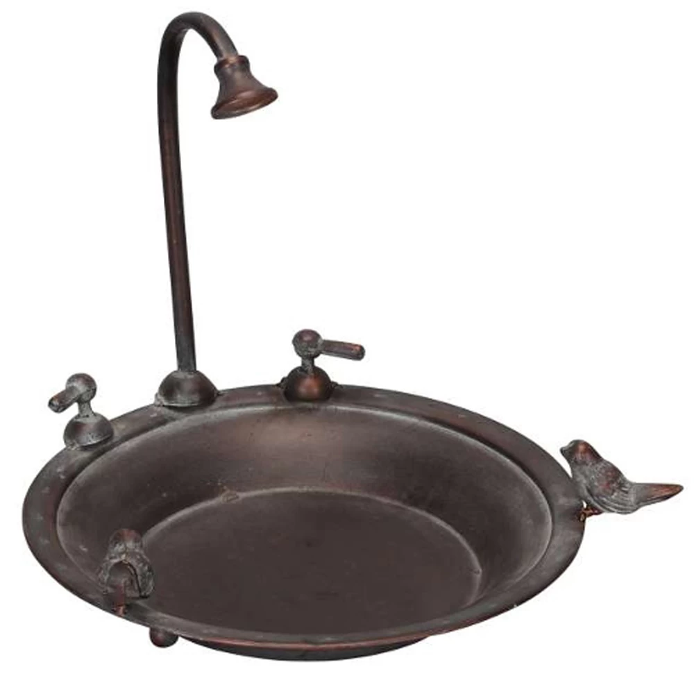Een prachtig koperkleurig vogelbad versiert met een kraantje en twee vogeltjes op de rand. Het bad is gemaakt van metaal en daardoor zeer duurzaam. Hoogte 32 cm, lengte 33 cm, breedte 33 cm.
