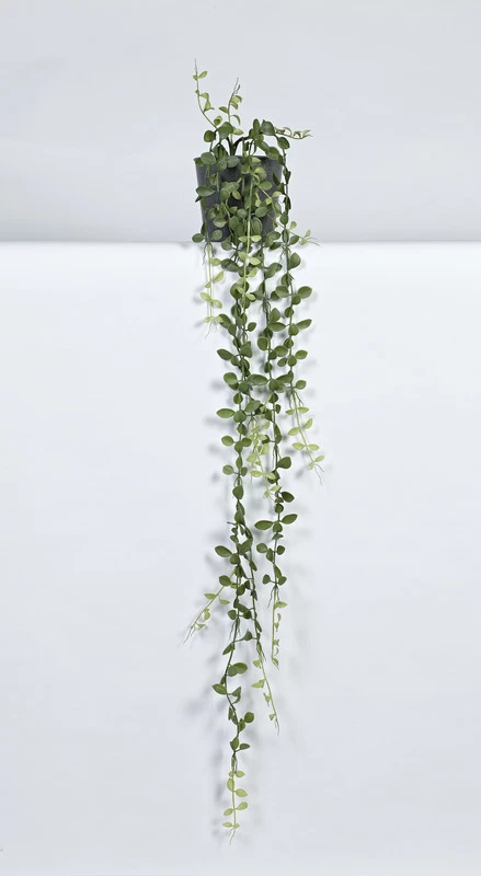 Dischidia hanger net een totale lengte van 105cm groen. Geleverd in een verzwaarde melanine donkere pot van 13 cm . Een lange hangplant met verfijnde groene blaadjes.
