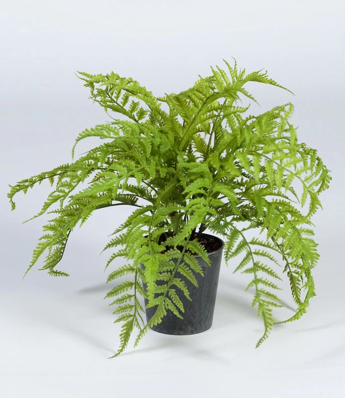 Een bosvaren in een verwaarde melanine pot. De totale hoogte is 42cm. Met zijn frisgroene bladeren past deze varen in elk interieur. De stelen bevatten ijzerdraad, zodat je de plant mooi kunt vormen.